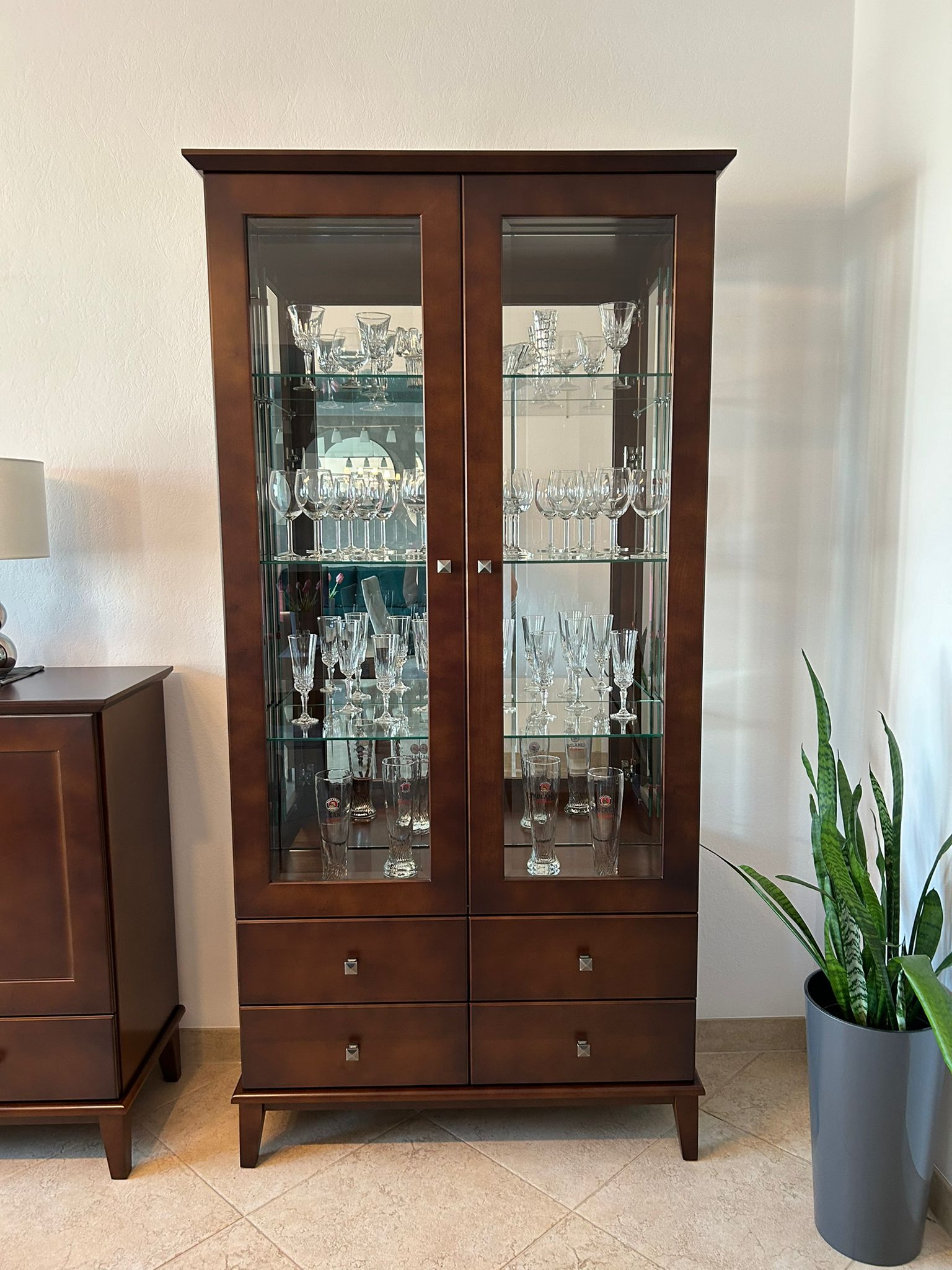 Półki – w szafkach przeszklonych standardowo są szklane, opcjonalnie, na życzenie Klienta, z płyty w okleinie naturalnej.